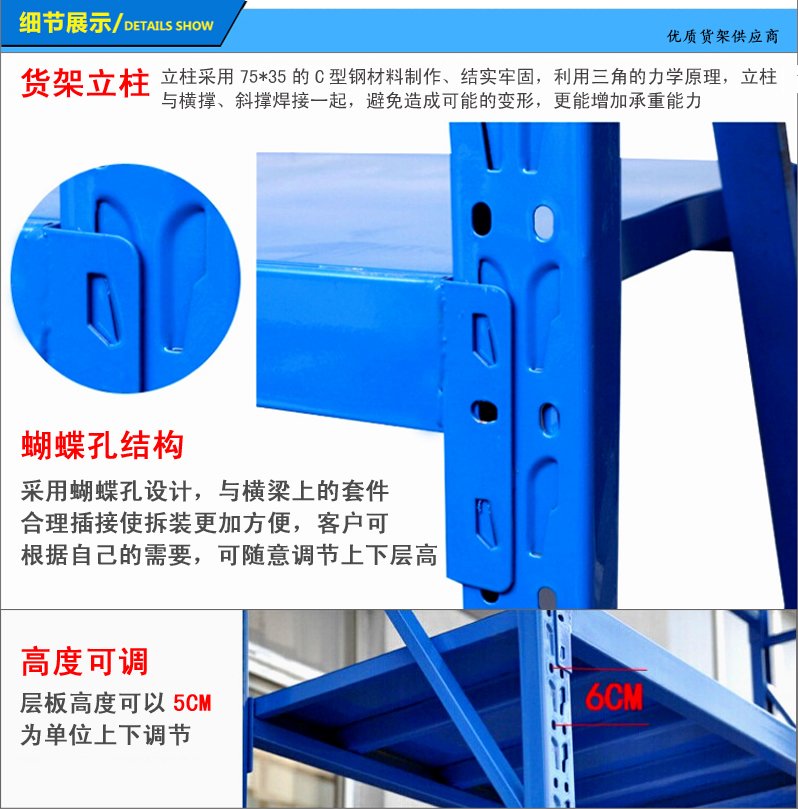 4、立柱設有每60mm調節孔距,可根據貨(huò)物高低任意調節。