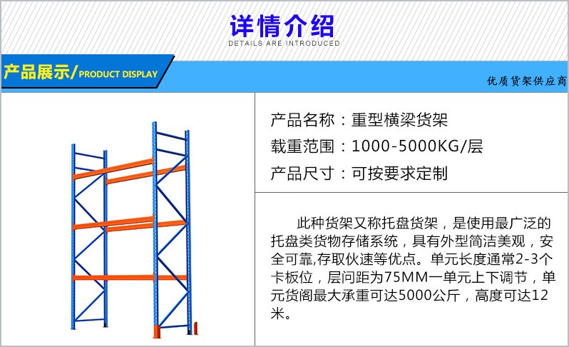 5、橫梁式重型貨(huò)架造價低,安裝和操作都很方便,查找(zhǎo)貨位容易,適用於任何(hé)搬運工具。