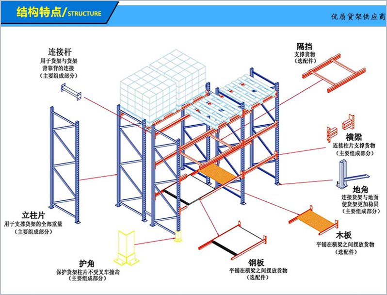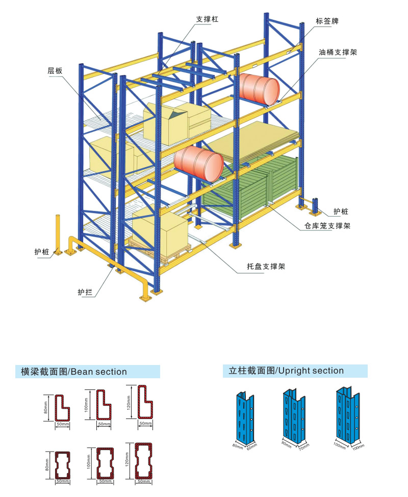 重型橫梁式貨架是目(mù)前使用應用廣泛的貨架(jià)類型之(zhī)一,具有較強(qiáng)的通用性,可適應各種類型的貨物,可按貨物尺寸要求調解橫梁高度。重型橫梁式貨架主要由立柱、橫梁、橫撐、斜撐以及自鎖螺栓組裝而成。橫梁與立柱的連接多采(cǎi)用機械式的鎖扣結構,可隨意拆裝組合。橫梁采(cǎi)用特製的(de)冷軋P型閉口梁;該結構(gòu)具有簡單可靠、重量(liàng)輕、承載力強、造價低的(de)特點;柱卡與立(lì)柱連接時配有特殊設計安全銷,可以確保橫梁在外(wài)力撞擊下不會脫落。可根據存儲單元集裝設備(bèi)的特(tè)性加裝如:隔檔(dàng)、鋼層板(木(mù)層(céng)板(bǎn))、金屬絲網層、倉儲籠導軌(guǐ)、油桶架等功能性附件。根據用(yòng)戶實際使用情況:托盤載重要求、托盤尺寸、倉庫實(shí)際空間、叉車實際提升高度,可提供不(bú)同(tóng)規格的橫梁式重型(xíng)貨架以(yǐ)供客戶選(xuǎn)擇。